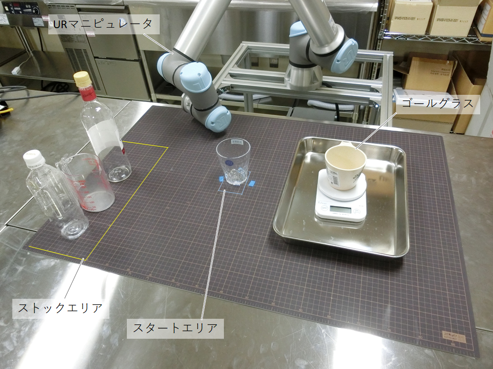 | URのロボットマニピュレータを用いて,テーブル上に固定したグラスに,飲料に見立てたビーズを注ぐ.飲料(ビーズ)は,ペットボトル,ビン形状のボトルなど,複数の容器に入っている. ルール詳細 |